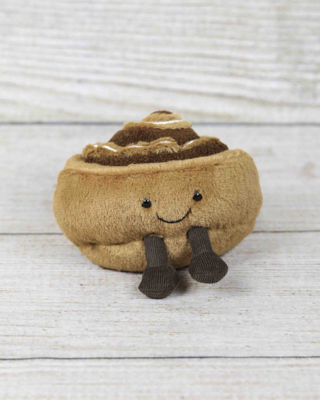 Amuseables Cinnamon Bun is the happiest sweet roll. Baked to perfection in golden brown fur, this cinnamon sweetie is rolled with a dark brown, textured filling, and drizzled with cream stitched icing. With fine cord legs and a big stitched smile, this cinnamon bun is the perfect foodie friend.