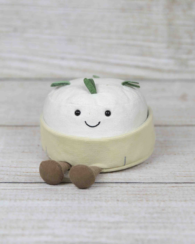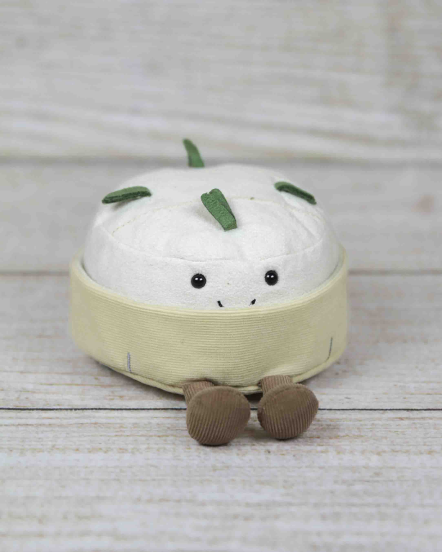 Amuseables Camembert is here to spread cheesy joy. This cream suedette cheese has stitched rind detail, and is topped with sprigs of suedette rosemary. Nestled in its fine cord container with staple detail, this smiling cheese can be taken out of its box for foodie hugs. The perfect gift for any foodie friend.