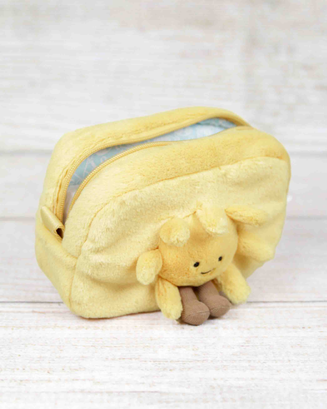 Consider Amuseables Sun Pouch your pocketful of portable sunshine… Finished with yellow fur, tiny boots and a zip-top close, this accessory staple is modeled after Amuseables Sun: amateur weather presenter (her motto: optimism first, accuracy second) and general joy to be around. Keep your essentials on hand and step out shining – no matter the weather outside!