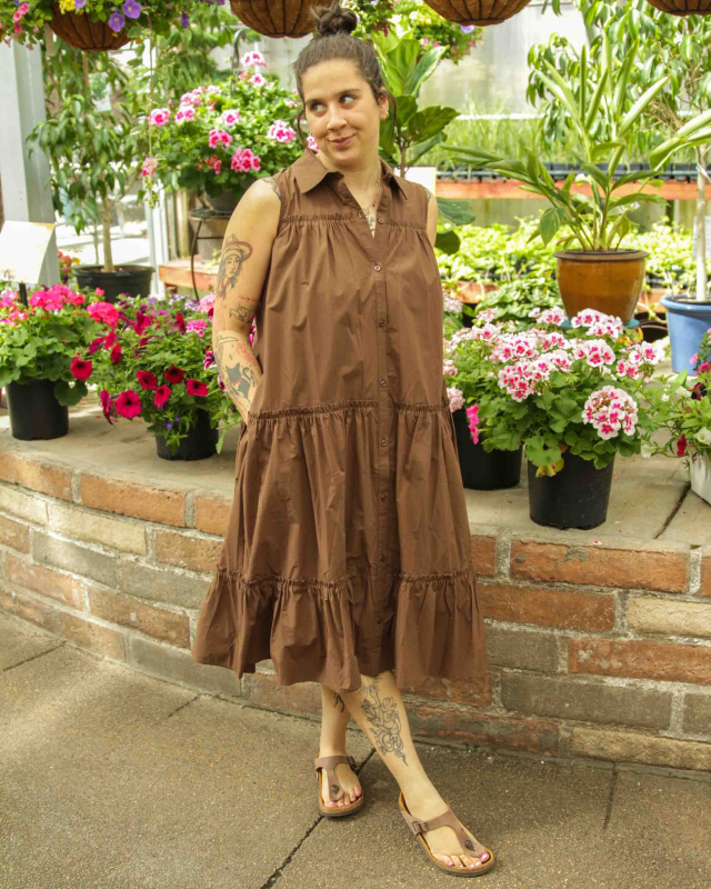 This sleeveless midi dress combines the structure of a classic button-down with a relaxed, tiered silhouette. Rendered in a rich chocolate brown, it’s a versatile staple for warm-weather layering or standalone wear.