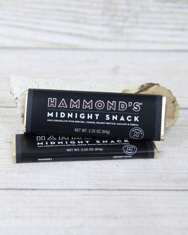 Delight your taste buds with Hammond's Midnight Snack Candy Bar! This milk chocolate bar is loaded with pretzels, cookies, peanut brittle, mallow, and cereal pieces. True midnight craving satisfaction.