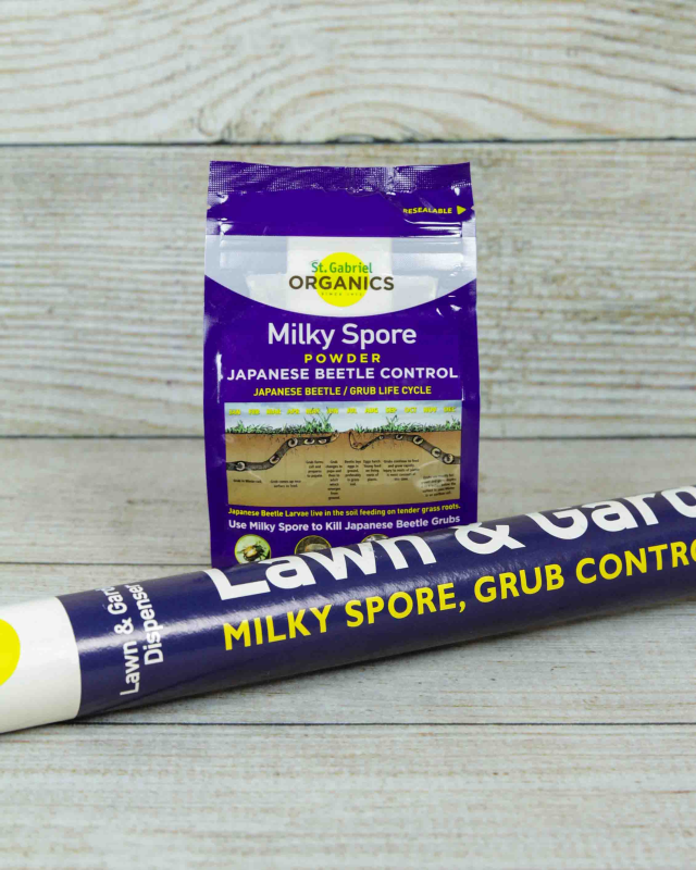 Japanese beetle larvae live in the soil feeding on tender grass roots. Milky Spore is a bacterium that infects and kills grubs. You apply milky spore to your lawn and water it in so grubs become infected by swallowing a spore when feeding on grass roots. The grub is killed 7 to 21 days later. As the grub decomposes billions of new spores will be introduced into the soil from one grub.