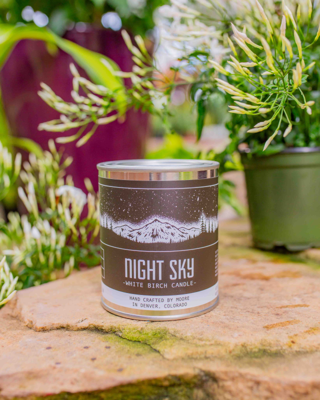 Cool, woodsy, and quietly bold, the Night Sky Candle is an all-natural soy candle inspired by starry skies and still forest nights. Crafted with the crisp scent of white birch, it features layered notes of eucalyptus, cypress, and tonka bean for a modern take on classic pine. Hand-poured in small batches by Moore in their Denver workshop.