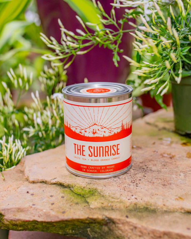 Bright, fresh, and full of promise, the Sunrise Candle is an all-natural soy candle crafted to capture the feeling of a new day. Hand-poured in small batches by Moore in their Denver workshop, this scent blends soft white tea with a hint of blood orange—creating a light, citrusy fragrance that’s both uplifting and serene. Inspired by the label artwork, this candle was designed to reflect the quiet optimism of early morning light.