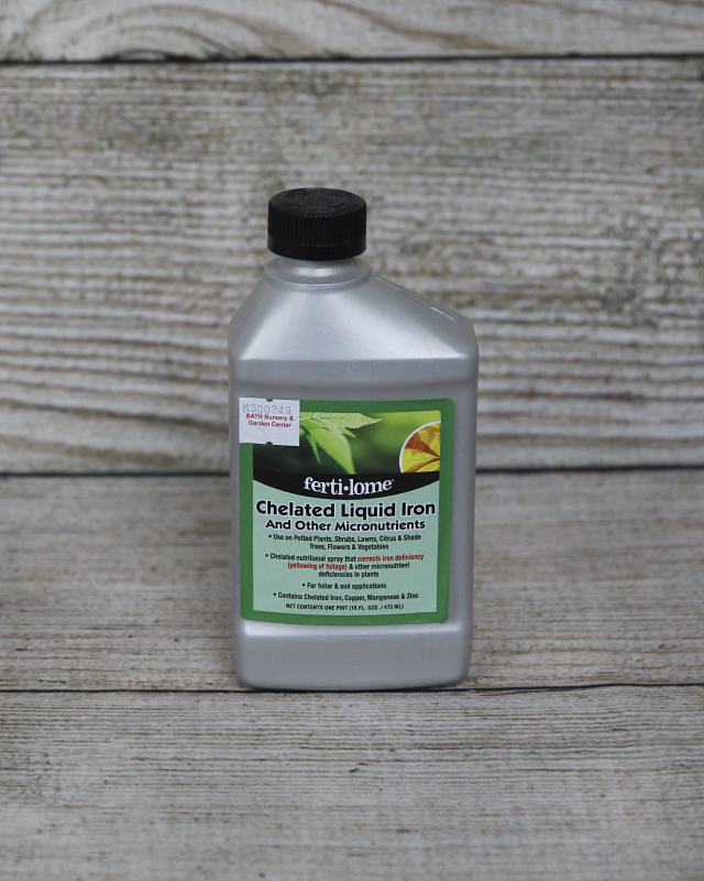 Chelated nutritional spray that corrects iron deficiency (yellowing of foliage) and other micronutrient deficiencies in plants.