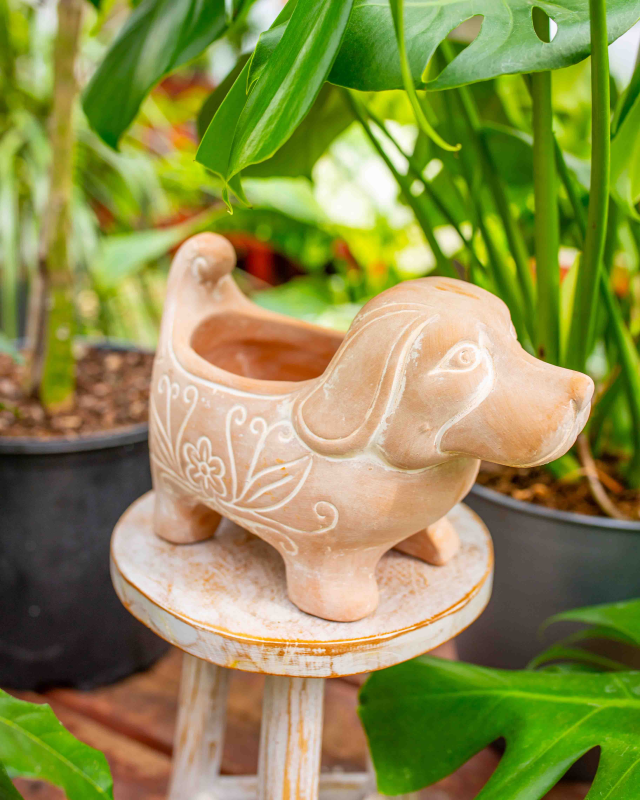 Sit. Stay. Grow! The Terracotta Dog Planter is a soulful, handcrafted tribute to a loyal companion. Each piece is hand-sculpted from natural terracotta and whitewashed by hand. The small size makes it great for plants like cat grass, string of pearls, or small herbs and succulents.