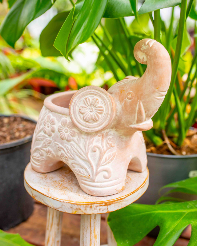 The Trumpeting Elephant Planter is a masterfully crafted piece that effortlessly announces your love for greenery. Hand-sculpted from natural terracotta and finished with a delicate whitewash, the glaze artfully settles into every carved detail to highlight its unique texture.