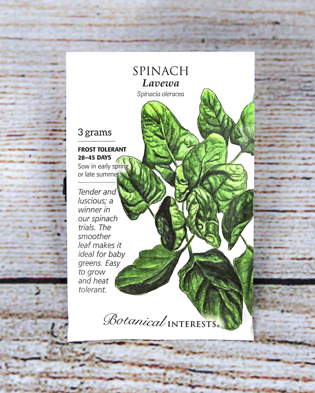 Rich, green color on productive plants, 'Lavewa' is an open-pollinated variety that competes with hybrids for flavor, heat tolerance, and mildew resistance. Spinach is high in vitamins, minerals, antioxidants, and low in calories.