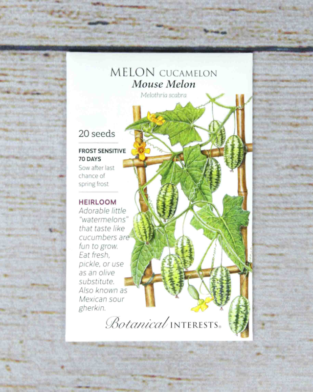 Cute, grape-sized fruits look like tiny watermelons with a cucumber flavor, often with a hint of tartness. Pickle and add to a martini for a fun visual twist! Also called sandita or Mexican sour gherkin because the fruits turn more sour as they mature. Long vines up to 10' produce plenty of "watermelons" to harvest from summer to fall. A terrific container or hanging basket variety!