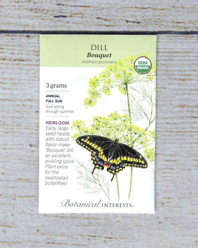 Particularly good for pickling because of early and abundant seed production, 'Bouquet's' foliage is also delicious sprinkled on potatoes, tomatoes, salmon, spinach, cucumbers, and lamb chops. Very aromatic. Dill is an important host plant for caterpillars of swallowtail butterflies.