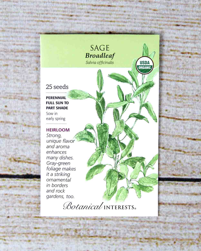 Sage's flavor is bold and assertive and considered very valuable as a digestive aid to high-fat foods, such as pork, wild game, and cheese. Often paired with stuffing, it also livens up vegetables, potatoes, soups, and stews. This drought-tolerant plant also has edible, purple-blue flowers that attract pollinators, and the gray-green foliage provides an excellent contrast in the garden or containers.