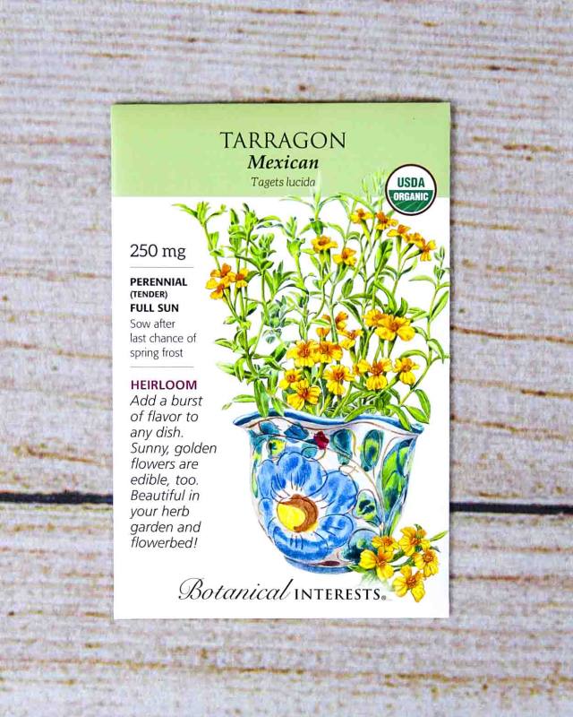 Mexican tarragon is a type of marigold that produces delicious leaves with notes of anise. It can be used as a substitute for French tarragon, and it is easier to grow in heat and humidity while being fairly drought tolerant. The leaves have a stronger flavor so less is needed to flavor a dish. Excellent container herb that can be grown indoors during the winter. Also called Mexican Mint and Spanish, Texas, or Winter tarragon.