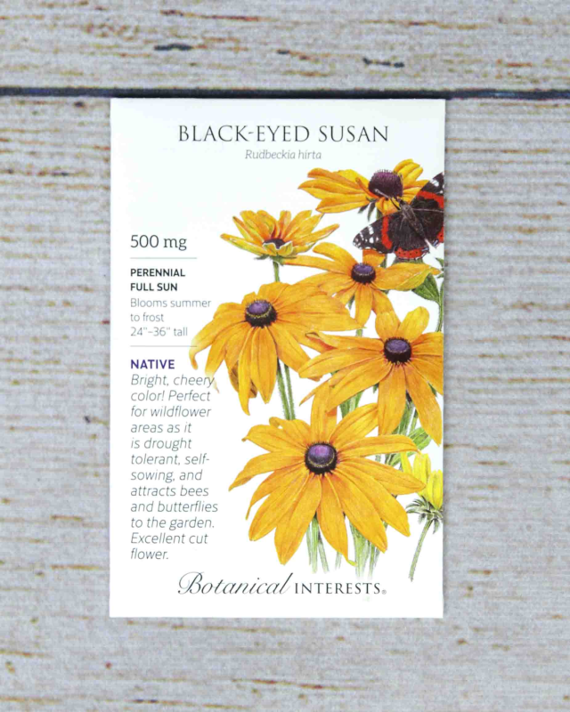 The state flower of Maryland has 2"-4" daisy-like flowers with orange-yellow petals. This beautiful, heirloom rudbeckia blooms over a long period--at least 8 weeks; winter seed cones supply food for birds, too. Black-Eyed Susan is a short-lived perennial (USDA zones 3-7), that may come back for a second or third year, but is often treated as an annual. Great cut flower. North American native wildflower; may re-seed itself and is an excellent addition to wildflower areas.