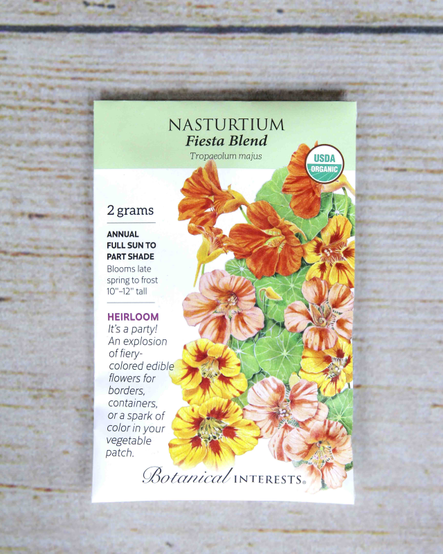 Every salad should have edible nasturtium flowers! Fiesta Blend is a spicy feast of color with flowers in orange, yellow, and orange/peach bi-colors. Grow some in your vegetable patch to repel insect pests., while attracting pollinators. Usually grown as an annual; perennial in hardiness zones 10 and warmer. Fairly drought tolerant once established. Rabbit and deer resistant.