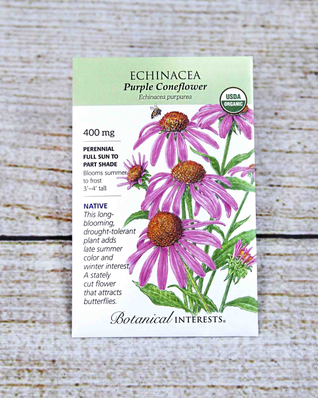 This treasured, heirloom wildflower, native to the eastern U.S., is a long-lived perennial that blooms for a month or more beginning in midsummer. The pinkish-purple petals of the stunning, daisy-like flowers surround a large, dark brown cone. Petals begin to droop as the cone enlarges and fills with seeds, which attract birds in the fall and winter. Echinacea grows well in a variety of conditions and is excellent for borders and water-wise gardens. Perfect for fresh-cut flowers.