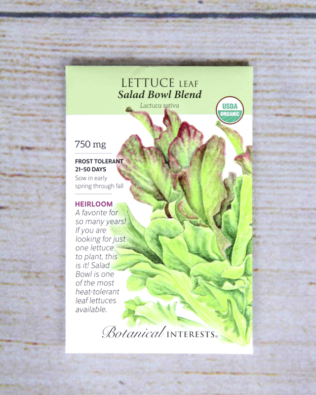 Fill your bowl with the mixed colors of Salad Bowl! This blend has it all; great flavor, good looks, and sweet leaves in heat-tolerant cultivars. The greens and reds look beautiful in salads and sandwiches. Harvest young for terrific baby greens. Successive sowings will produce sweet lettuce from spring through late fall! This packet sows up to 133 feet.