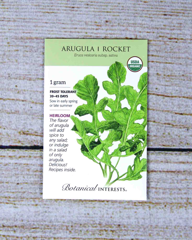 Arugula's flavor has been described as peppery, mustardy, and hot with a hint of tartness. It adds such an exciting, interesting flavor to salads. Most often eaten raw in salads but also steamed or added raw to many other dishes such as pizza. Tender baby greens are ready in 20–28 days, at 2–4 inches tall. Also a good container variety.