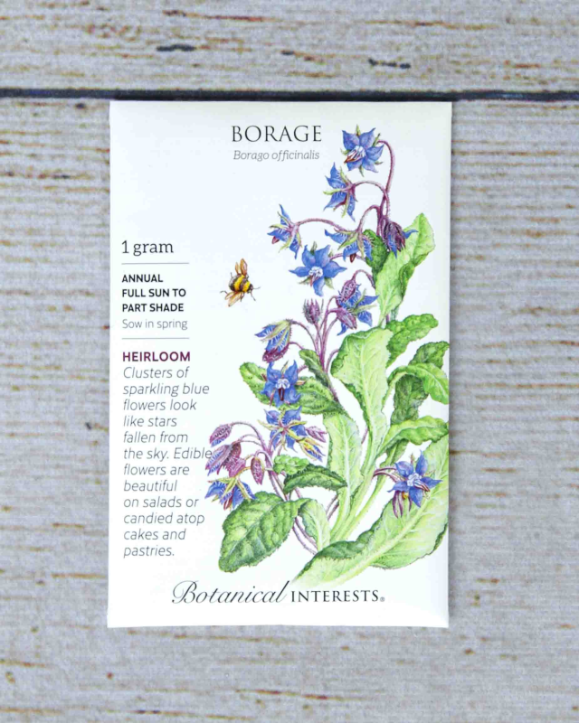 This 2'–3' tall, versatile herb is exquisite in the garden. In addition to attracting bees and other beneficial insects, it can be used as a cover crop. Edible, blue and sometimes pink flowers with a cucumber-like flavor can be used fresh to garnish dips, salads, and summer drinks, or candied with sugar for later use. The leaves and stems are also edible, delicious steamed like spinach or chard. Fairly drought tolerant once established.
