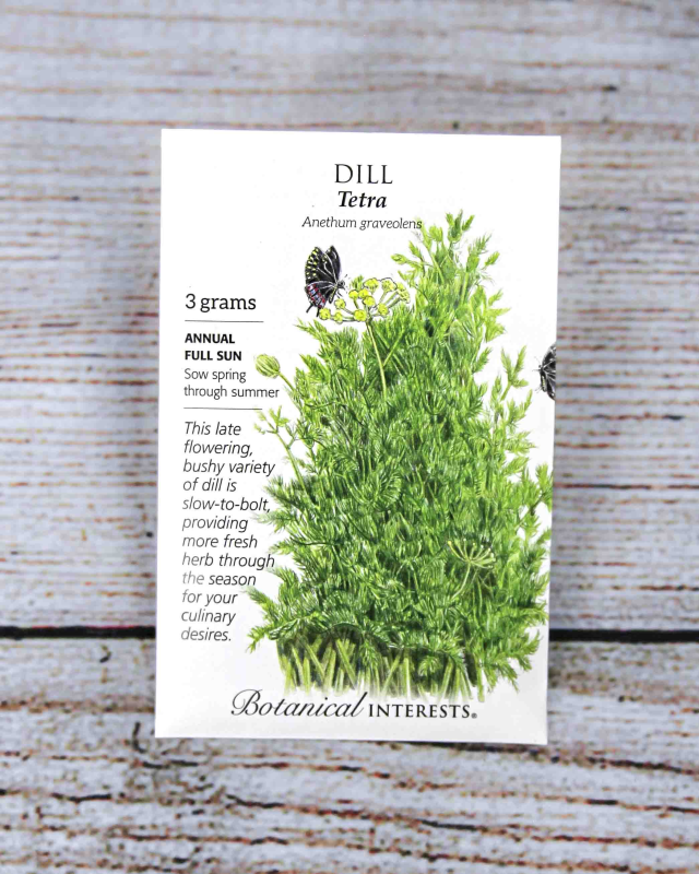 The refreshing flavor of dill will surely win you over (if you don't already love it)! 'Tetra' is a bushy, late-flowering variety, meaning more leaf production for dill lovers. It is heat tolerant which makes it slow to bolt, so you will enjoy fresh-picked, aromatic dill throughout the season. Dill is an important host plant for caterpillars of swallowtail butterflies.