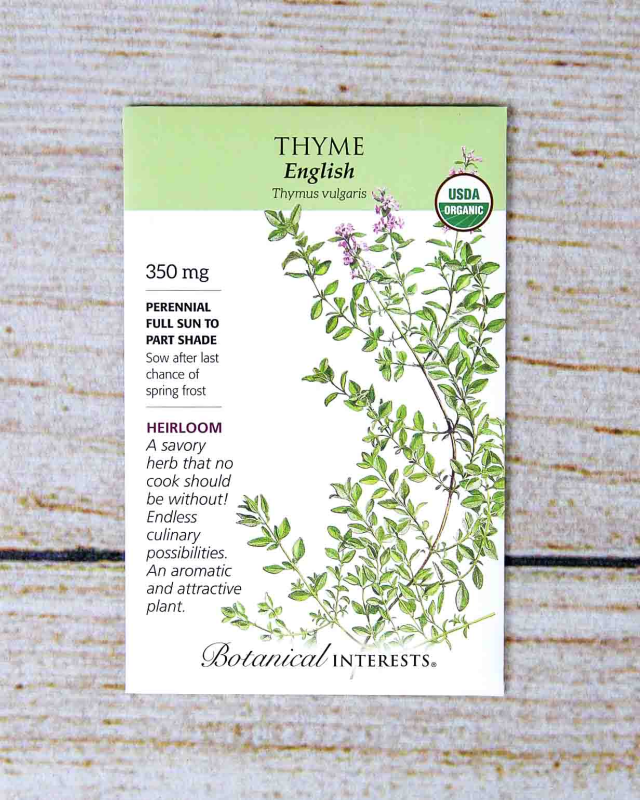 An invaluable seasoning in the kitchen, thyme has a subtle, woodsy flavor that complements a variety of foods. A staple herb of chefs, and one of the primary ingredients of bouquet garni. With very small leaves and delicate, edible flowers, thyme makes a lovely, drought-tolerant, 12-inch tall landscape plant; use as a low hedge around your herb or vegetable garden. An excellent container plant to enjoy indoors or out.