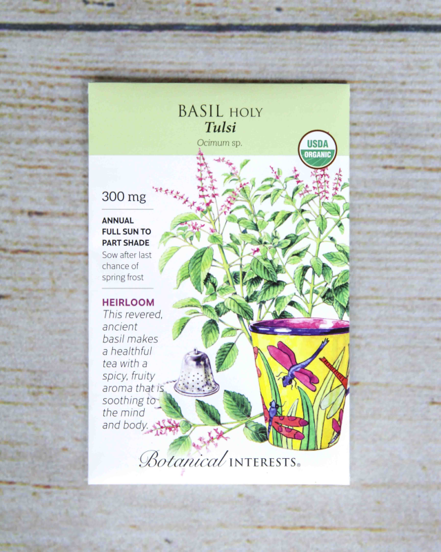 Known as the Queen of Herbs in India, tulsi is considered to be sacred. This type of holy basil is also known as kapoor, or temperate basil. It is distinguished by its bubble-gum scent, frost-tolerance, and fast-growing nature. Its health-promoting properties are said to help combat stress and other medical concerns. If allowed to flower, it is a bee magnet and it may reseed. Grow indoors for a continuous supply of fresh leaves throughout the winter. This packet sows up to 72 feet.