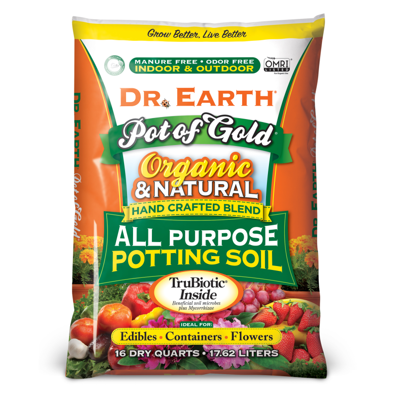 Grow pots of gold with Dr. Earth's All Purpose potting soil! It's perfect for veggies, fruits, and any edible seeds or starters and is destined for container plants and flowers.