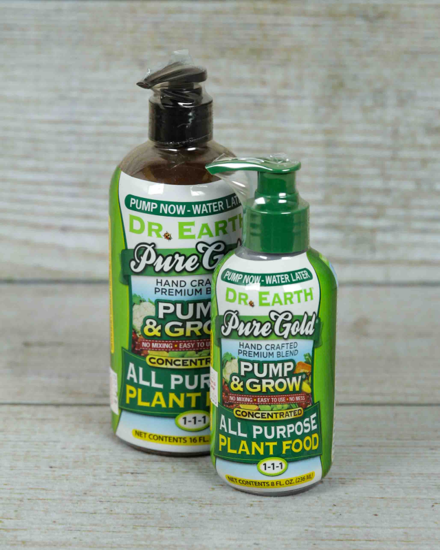 Dr. Earth Pure Gold Pump & Grow All Purpose Plant Food is a liquid fertilizer suitable for all plants throughout the year. It is easy to use with no mixing. This organic fertilizer is people-safe and pet-safe when used as directed, making it ideal for gardens around children and pets.
