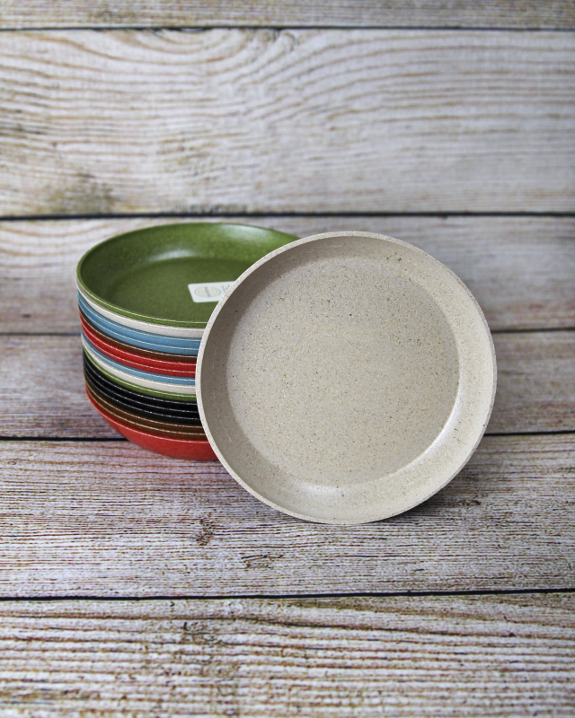 Biodegradable saucer made with rice hulls and natural binding agents.