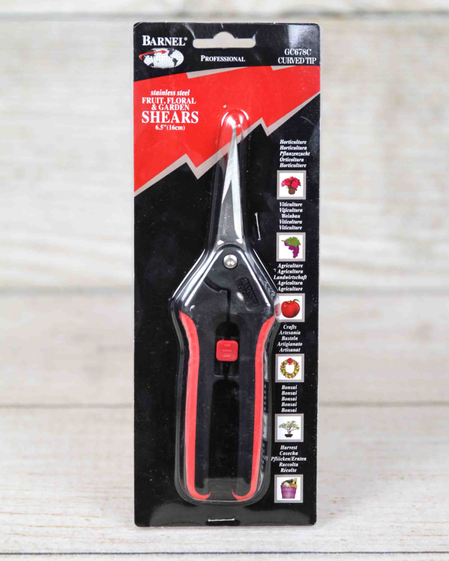 This high-quality, lightweight 6.5-inch garden shear with a curved, needlenose blade is designed for precision work. This specific blade shape is ideal for getting into tight spaces and making clean, precise cuts on delicate stems, flowers, and fruit. Crafted with durable, rust-resistant stainless steel blades, these shears ensure a sharp and reliable edge for clean cuts, minimizing damage to plants.