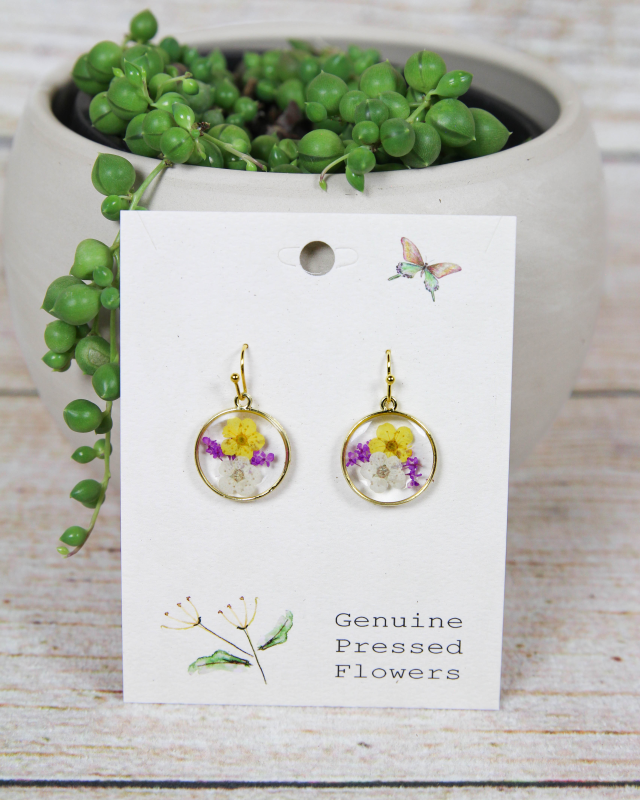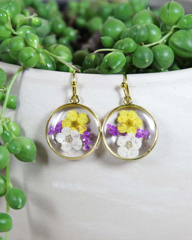 These yellow, purple, and white pressed flower earrings are a captivating and vibrant accessory that beautifully combines the enchanting colors of nature with the elegance of fine jewelry. These earrings feature real dried flowers meticulously preserved to retain their vivid hues and intricate textures. The centerpiece of each earring showcases stunning yellow and white dried flowers, radiating warmth and vitality. The yellow petals exude a sense of joy and optimism, adding a cheerful touch to the design. Surrounding the yellow and white petals, delicate purple dried flowers are carefully arranged, creating a harmonious contrast that evokes a sense of enchantment and elegance. Encased in a transparent resin, the flowers maintain their natural form and delicate details, providing a glimpse into the beauty of nature.