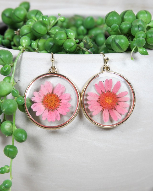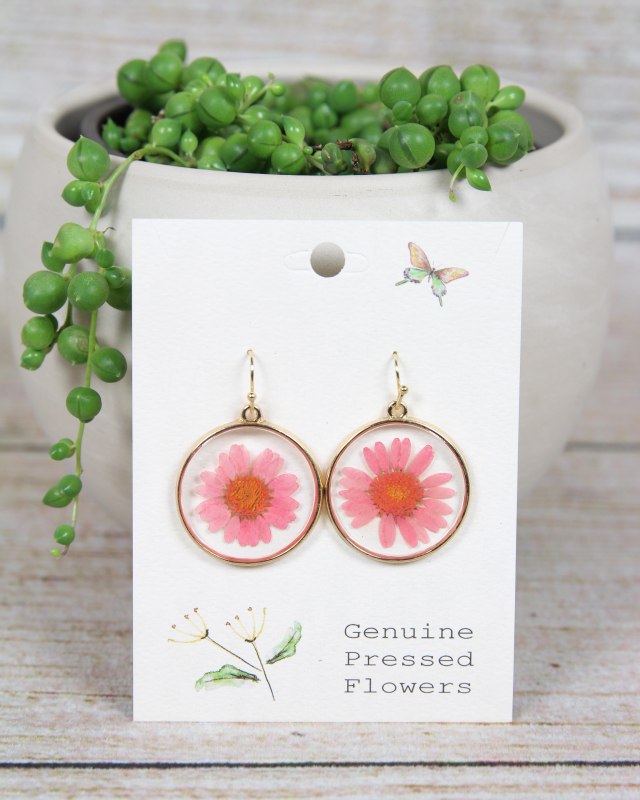 The Pink Chrysanthemum pressed flower earrings are a stunning and enchanting accessory that combines the delicate beauty of nature with the elegance of fine jewelry. These earrings feature genuine pink chrysanthemum flowers that have been carefully preserved and dried to maintain their natural color and intricate details. Each chrysanthemum flower petal is gracefully encased within a transparent resin, showcasing its unique shape and texture. The soft, pastel-pink hue of the petals adds a touch of femininity and charm to the overall design. The gold trim surrounding the flowers adds a luxurious touch, enhancing their beauty and creating a captivating contrast.