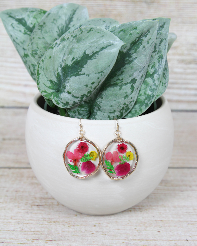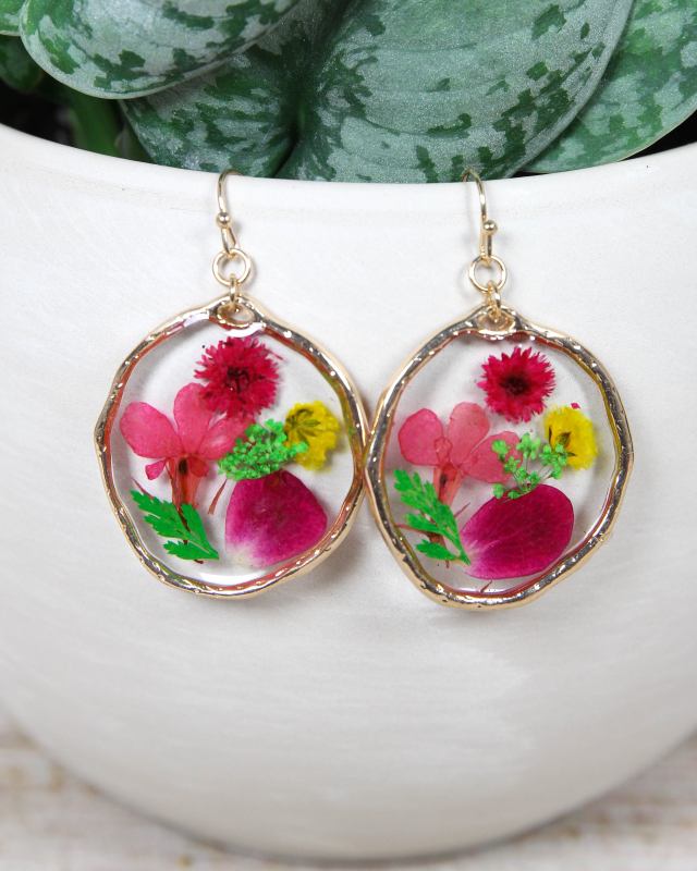 Our large pressed flower bouquet earrings are a delightful and charming accessory that captures the beauty of a vibrant bouquet of flowers in a wearable form. These earrings showcase a collection of real pressed flowers carefully arranged to create a miniature bouquet, adorned with delicate gold trim. Encased within a transparent resin, the pressed flowers are protected and showcased, allowing their beauty to be admired from every angle. The gold trim gracefully surrounds the bouquet, adding a touch of luxury and elegance. The meticulously shaped gold trim creates a delicate frame that enhances the overall charm of the floral arrangement.