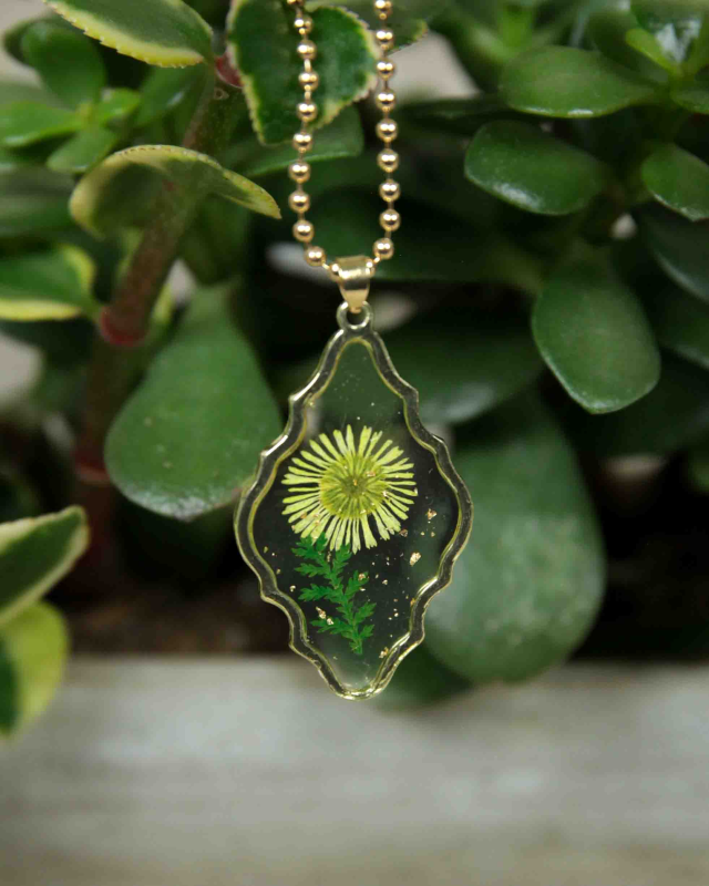 Bring home cottage style with genuine pressed flower jewelry! This delicate gold vintage shape necklace features dried yellow daisy flower set in clear acrylic with a gold border. Natural and sweet vintage design with yellow flower, green leaves and gold foil accents..