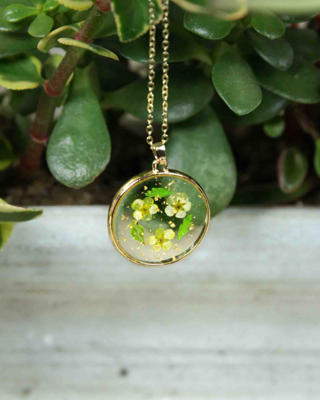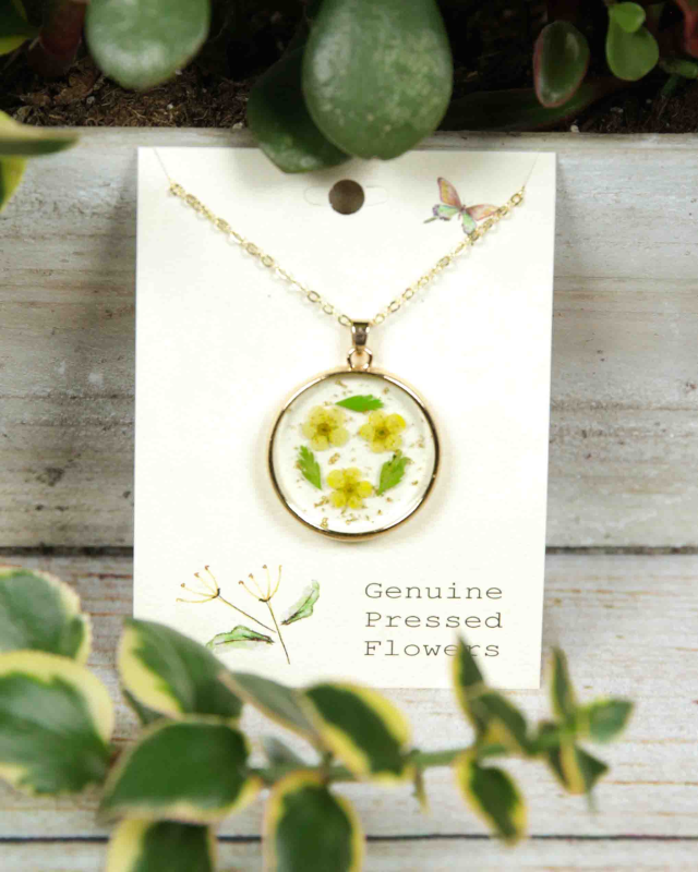Bring home cottage style with genuine pressed flower jewelry! This delicate gold large circle necklace features dried yellow flowers set in clear acrylic with a gold border. Natural and sweet vintage design with yellow dried flowers and gold foil accents.
