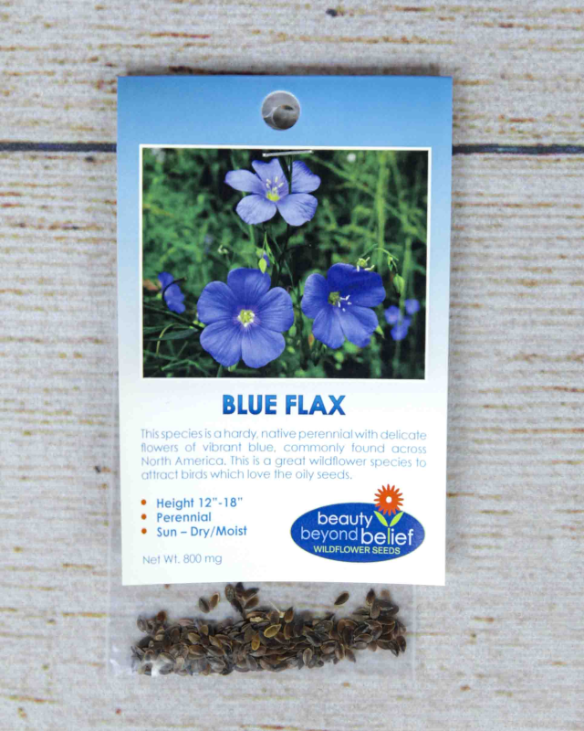 This perennial Flax species was selected for outstanding vigor, beauty, and competitiveness with grasses prevalent on sites where it was collected. Blue Flax is a hardy, relatively short-lived, naturalized perennial, 12 to 36 inches tall, with deep blue flowers that bloom profusely for about six weeks beginning in mid-May. It is well adapted to sunny open slopes, well-drained soils from moderately basic to weakly acidic, 10 to 18-inch rainfall areas, at 1,000 to 6,000 feet elevation. This is a great wildflower species to attract birds, which love the oily seeds. Single flowers range from vibrant blue to light blue on tall, branching stalks with blue-green foliage. Blue Flax seeds will germinate in about two weeks in a sunny to partially sunny location. The plants may re-seed themselves annually. Planting in the late fall to winter will allow the seeds to overcome the natural dormancy for quicker germination in the spring.