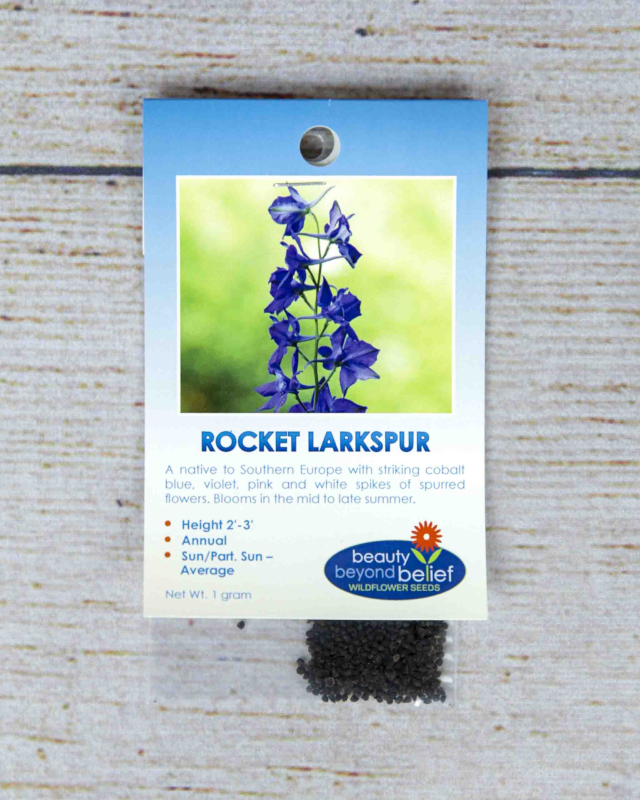 The tall spikes of striking cobalt blue, pink, and white spurred flowers will brighten gardens and meadows in the mid to late summer adding color and texture. These naturalized annuals, originally from southern Europe and the Mediterranean, are vigorous growers with prolific blooms towering over feathery foliage. Thrash the seed pods of Rocket Larkspur also known, as wild Delphinium, to scatter the seed on the ground for new plants the following season. The seeds will lay dormant until temperatures and moisture are enough for germination. Plant extra as they make great cut flower bouquets! These prefer above-average moisture and well-drained soils. Rocket Larkspur is extremely easy to grow and can be planted in almost any spot. Remember, the seeds and plants are poisonous so do not consume them. But that is what makes them deer-resistant!