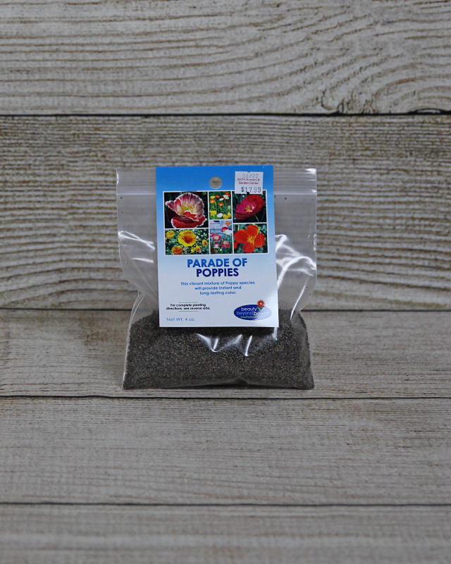 Flower Species Included: Mixed Shirley Poppy, Red Shirley Poppy, Iceland Poppy, Orange California Poppy, Red California Poppy, White California Poppy, Mexican Poppy.