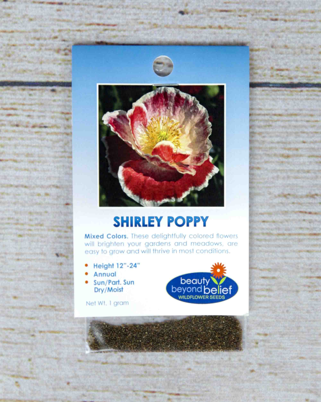 This delightfully colorful species derived from the European, wild, Flander’s Poppy is easy to grow and will thrive in most areas of the country. Shirley poppies will brighten any wildflower meadow and can make excellent cut flowers if the cut stem is first singed. The mixed colors of red, pink, white , and salmon flowers have single and double-petal forms with compact basil foliage.
