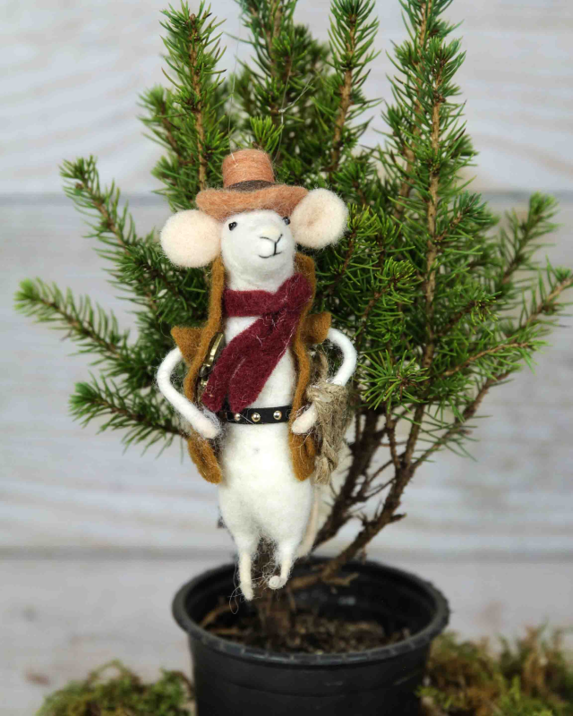 This whimsical felt ornament features a brave and adventurous cowboy mouse. Dressed in a miniature cowboy hat, bandana, vest and belt, the mouse stands proudly in your Christmas tree or on a shelf. A perfect addition to any Western-themed decor or a unique gift for a cowboy enthusiast.