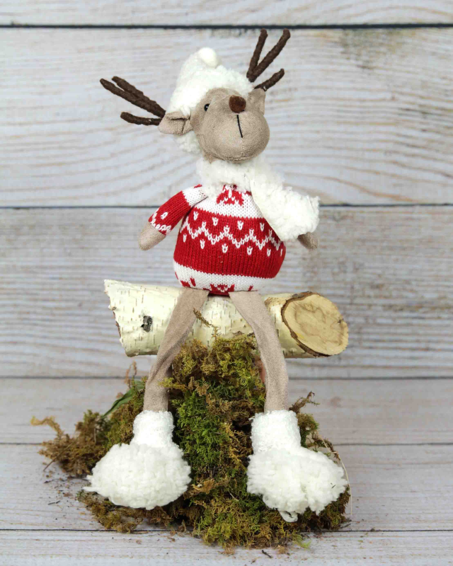 Bring a touch of Scandinavian charm to your holiday decor with the Dangle Leg Reindeer. This adorable plush reindeer features a classic red and white knitted sweater with white boots, hat and scarf, and playful dangling legs. Its soft, cuddly texture makes it a perfect addition to any room, whether it's displayed on a shelf or mantle.