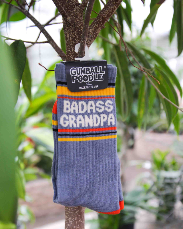 He spoils the grandkids. He still kind of scares dad. His stories go nowhere. Badass grandpas don’t retire—they just upgrade their sock game. These super-comfy, unisex, one-size-fits-most Gym Socks are made in the USA of Medium Grey Cotton with accents of Gold Nylon, Black Nylon, Orange Nylon, Cream Nylon.
