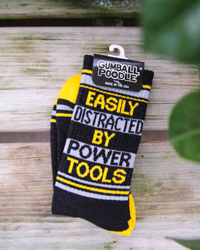 For the one who can’t walk past a hardware aisle without getting a buzz. These socks are here to support any loud, sawdusty ambitions. These super-comfy, unisex, one-size-fits-most Gym Socks are made in the USA of Black Cotton with accents of Gold Nylon, Gail Grey Nylon.