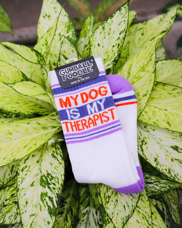 These socks scream louder than your bark-happy beagle at the door! Adorned with "MY DOG IS MY THERAPIST" on pristine white accented with vibrant purple and playful orange stripes, they're perfect for lounging, dog park jaunts, or just showing off your paw-some style at the next pet parents' meet-up. Feel the fuzzy warmth of your furry friend, even on your feet. Why wear boring socks when you can celebrate your true soulmate? Grab a pair, flaunt your paw pride, and spark conversations with fellow dog lovers!