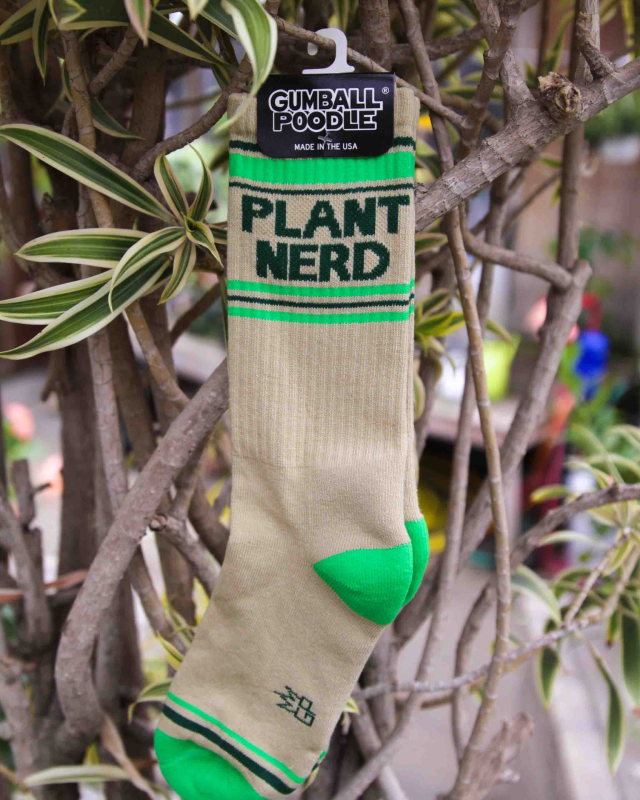 What's the perfect catch-all for gardeners and horticulturists alike? Plant Nerd! Lean in with socks that call it like they see it, and tend to your plants in style. 🌱 These super-comfy, unisex, one-size-fits-most, Gym Socks are made in the USA of Lt. Khaki Cotton with accents of Kiwi Green Nylon, EV Green Nylon.