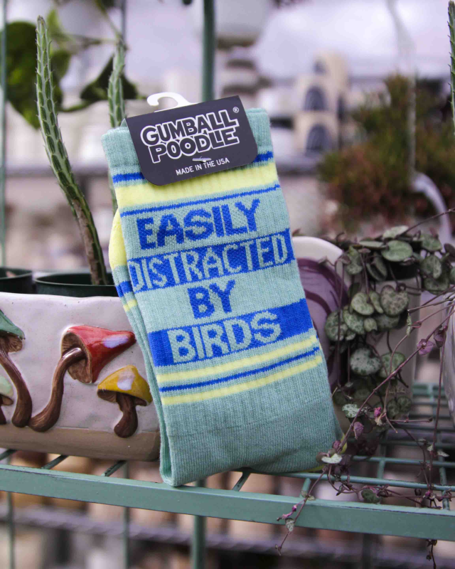 Let's face it. Birds are crazy (and not real). Rock hard noses that are also mouths... forks for feet... and they fly? No wonder you're distracted. Let these socks keep you grounded. 🐦 These super-comfy, unisex, one-size-fits-most, are made in the USA of Marled Teal Cotton with accents of Bahama Blue Nylon, Yellow 2 Nylon.
