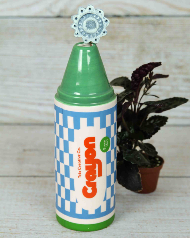This adorable vase ditches the typical floral container design in favor of a playful hand-painted ceramic crayon. The "crayon" is a rich green, accented by a playful cream and blue checkered pattern that wraps around its cylindrical body. There's no drainage hole at the base, so it's best suited for artificial flowers or arrangements that don't require water.