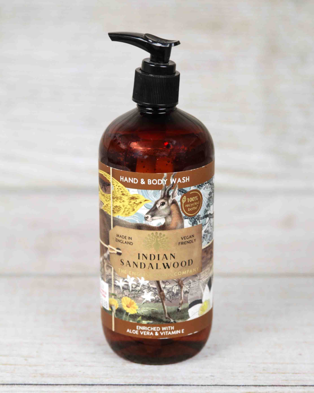 Lather up with a luxury liquid soap that is vegan friendly and full of ingredients like vitamin E and aloe vera to leave your skin feeling cleansed, fresh and lightly fragranced. Indian Sandalwood Hand and Body Wash is fragranced with warm sandalwood and a touch of pepper, creating a rich but spicy scent. A heart of pine, orange flower, cedarwood and clove balances the fragrance against a base of dry amber, tobacco and musks.