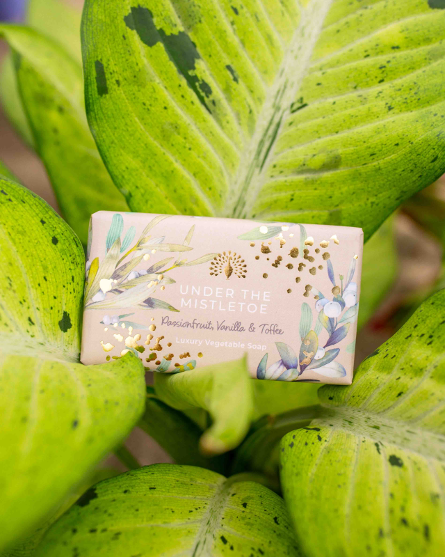 Experience luxury self-care with this Christmas Tidings Under the Mistletoe soap. Beautifully fragranced and expertly crafted from high quality ingredients, enriched with aloe vera and vitamin E. Under the Mistletoe opens with top notes of zesty lemon, mandarin, and pineapple. The heart is composed of passionfruit, dewberry, and spicy cumin, leading to a rich base of patchouli, vanilla, toffee, and musk.