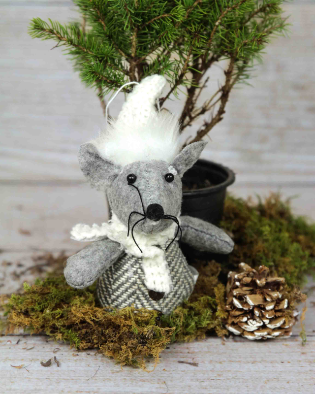 The Plush Grey Mouse Ornament is an adorable and cozy addition to your holiday decor. This soft, plush mouse is crafted from grey felt and features charming details like black bead eyes, a black nose, string whiskers, and dangling arms. Its white hat and matching scarf add a festive touch!