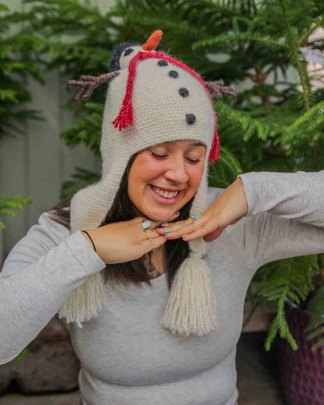 Get into the winter spirit with this adorable Hand-Knit Snowman Hat from Peruvian Trading Co.! Expertly crafted by skilled Peruvian artisans, this whimsical chullo-style hat brings holiday cheer and cozy warmth to any chilly day.